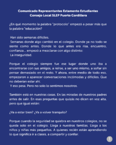 27.04.26. A través de un sentido comunicado, representantes de los estamentos estudiantiles del Consejo Local de Educación Pública (SLEP) Puerto Cordillera manifestaron su preocupación frente a situaciones que han afectado la percepción de seguridad en los establecimientos educacionales del territorio.