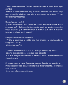 Los representantes estudiantiles también hicieron un llamado a la comunidad educativa a no naturalizar estas situaciones y a mantener una actitud activa frente a cualquier hecho que afecte la seguridad y el bienestar. “Vinimos a aprender, a compartir y a soñar, no a sobrevivir”, expresan en el documento.