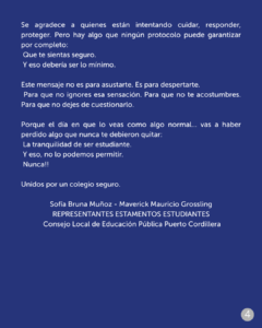 En esa línea, Sofía Bruna Muñoz y Maverick Mauricio Grossling, representantes estudiantiles que suscriben la carta, señalaron: “Este mensaje nace desde lo que estamos sintiendo como estudiantes. No podemos acostumbrarnos al miedo ni aceptar que sea parte de nuestra vida escolar. Queremos espacios donde podamos aprender tranquilos, compartir y proyectar nuestros sueños sin inseguridad”.